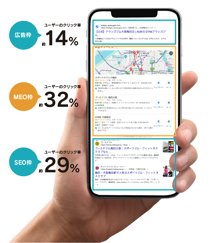MEOとは、『Map Engine Optimization』の略称で、Googleマップでの検索(ローカル検索)にて自社の店舗情報やビジネス情報を検索ユーザーに見つけやすく施策をし、競合他社の店舗情報より上位に表示されるよう対策をすることを指します。