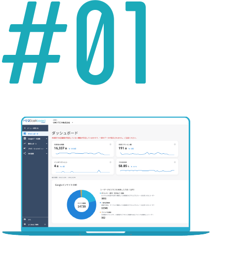 独自開発したMEO順位計測ツール「MEO Dashboard」を用いて、日々のキーワード別順位やGoogleインサイト情報の閲覧が可能。Googleビジネスプロフィール(旧Googleマイビジネス)API連携によりビジネス基本情報の更新、写真管理、クチコミ管理もこのツールで一括管理が可能となります。
